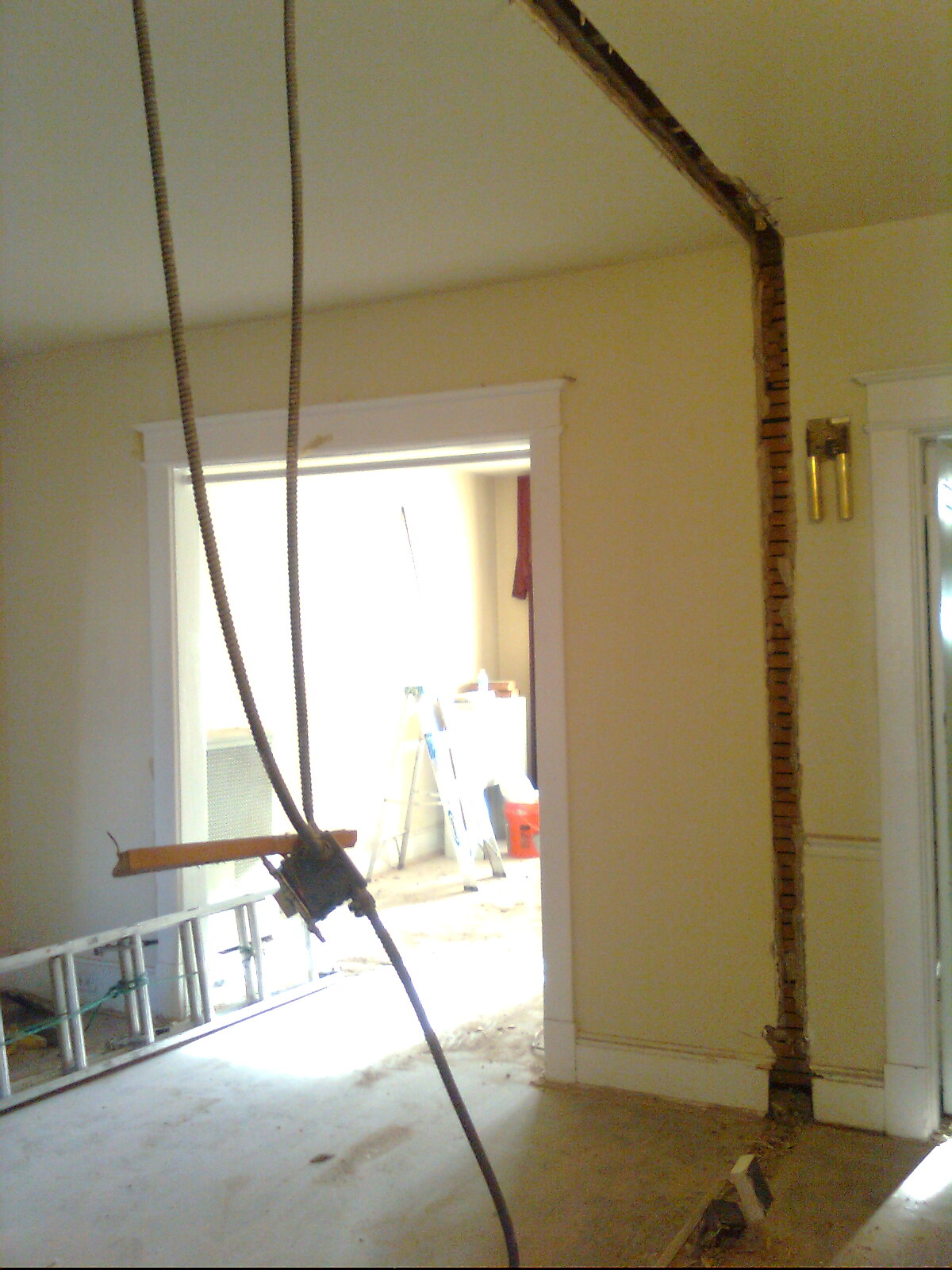 They knocked down the wall between the kitchen and the dining room to consolidate the cooking appliances in one room and give it an open, airy feeling. The cords and black box are the electric wiring and old light switch.
